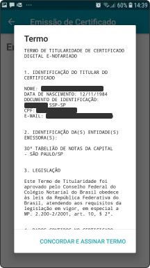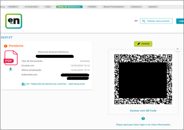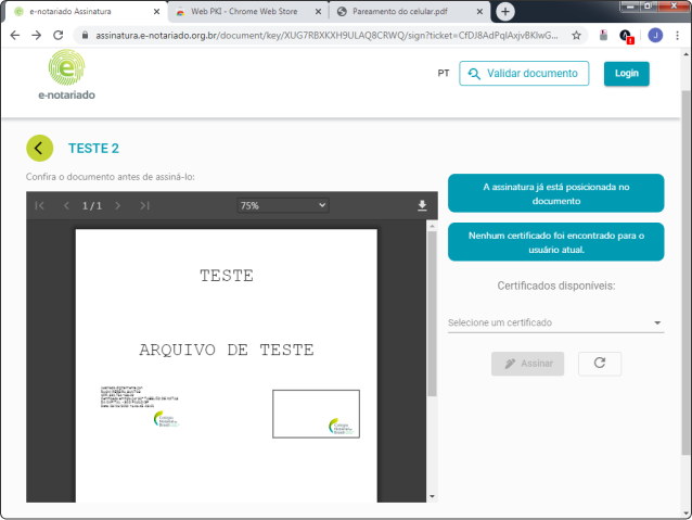 Uma vez selecionado o certificado e-notarial, clique em assinar